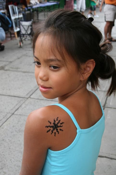 Por un lado están los archiconocidos tatuajes temporales de henna. La henna se forma a partir del polvo que se extrae de la planta Lawsonia Inermis (comúnmente conocida como Henna). Esta tinta funciona uniéndose con la queratina de la piel. A diferencia de otros tatuajes temporales, los de henna no cuentan con una gran cantidad de colores; no escapan de las gamas del marrón, el negro y, sobre todo, el rojo, que es el color natural de este producto. En cuanto a su duración, depende del cuidado que se le dé, pero como máximo pueden permanecer en la piel durante un mes.