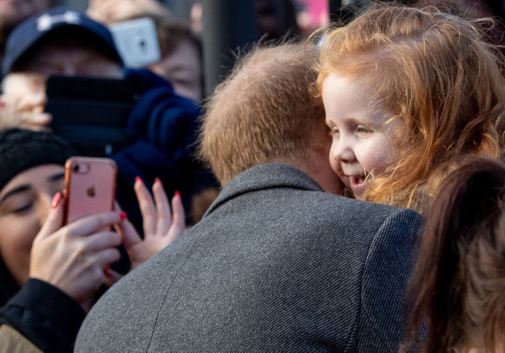 La pequeña niña de 4 años de nombre Eliza lo esperaba entre el tumulto con un cartel que decía: «Pelirrojos unidos. Te amamos, Harry», en referencia al color del cabello de ambos. El príncipe no pudo pasar por alto la ternura de esta jovencita y acudió a saludarla, no sin antes explicarle que su iniciativa le había gustado mucho: «'Pelirrojos unidos', me encanta esto». Luego, le preguntó con picardía: «¿Amas tu cabello? El letrero es hermoso».