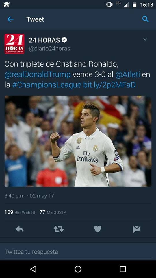 Alguien tenía mucha prisa por arrobar al Real Madrid en este tuit pero, sin darse cuenta, puso a jugar futbol a Donald Trump.