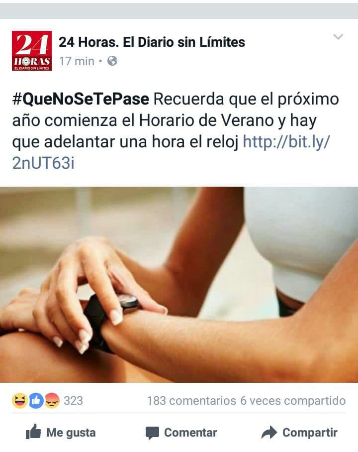 Según este tuit del diario 24 horas, falta un año para que adelantemos los relojes por el Horario de Verano.