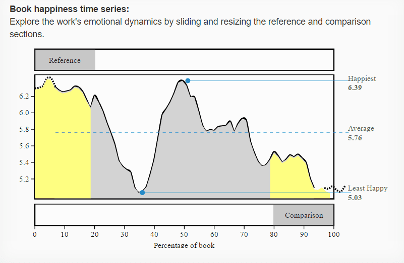 Los estudiosos de la literatura han discutido por décadas (perdón, desde Aristóteles, así que milenios) cuántas estructuras le podemos dar a la cronología del personaje. Lo que el equipo de la Universidad de Vermont a cargo de Andrew Reagan hizo (tomamos los resultados que reportó el MIT) fue analizar un montón de obras literarias y procesar sus datos informáticamente. Data mining, en inglés. Identificaron marcadores de felicidad e infelicidad, de desgracia y de conseguir las metas: la emoción de las palabras a través de la historia.
