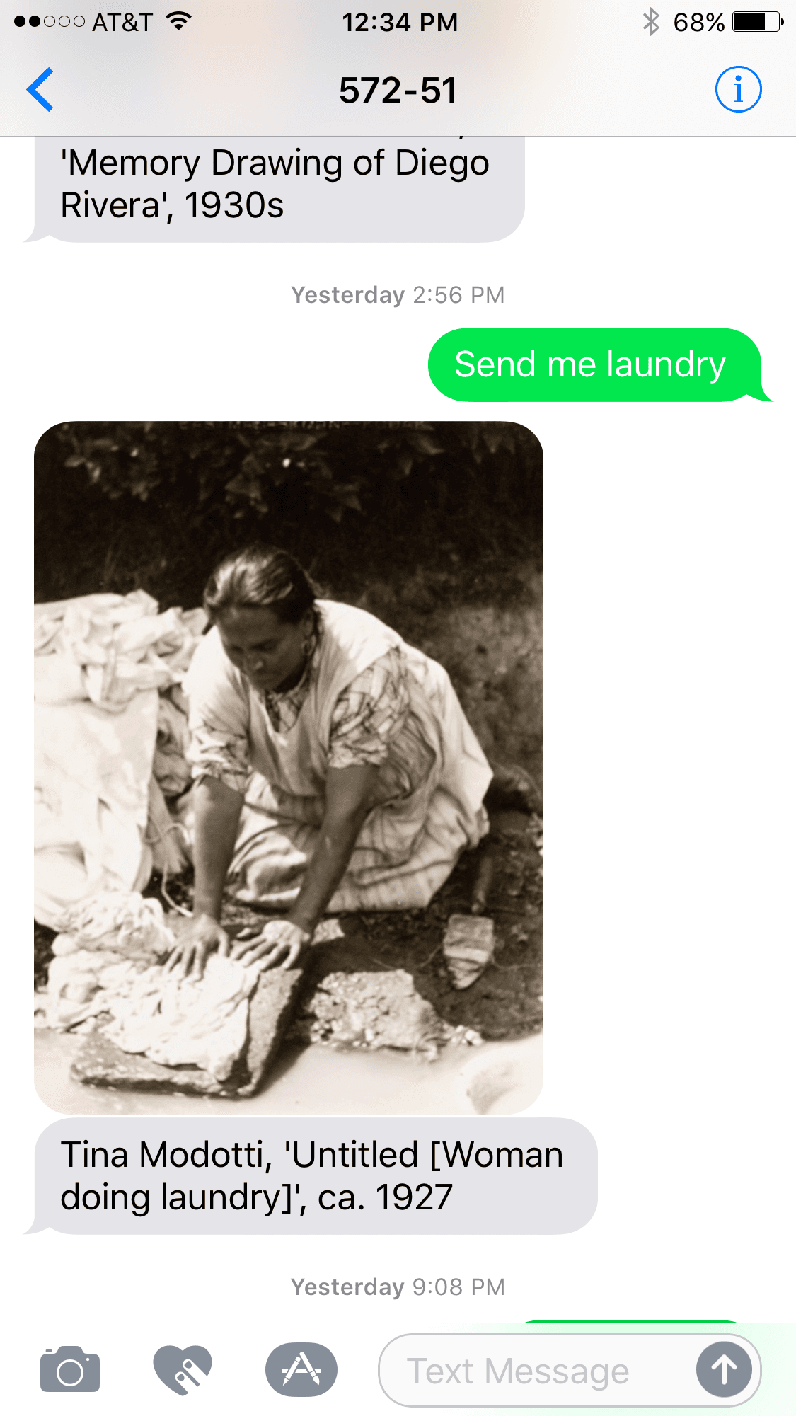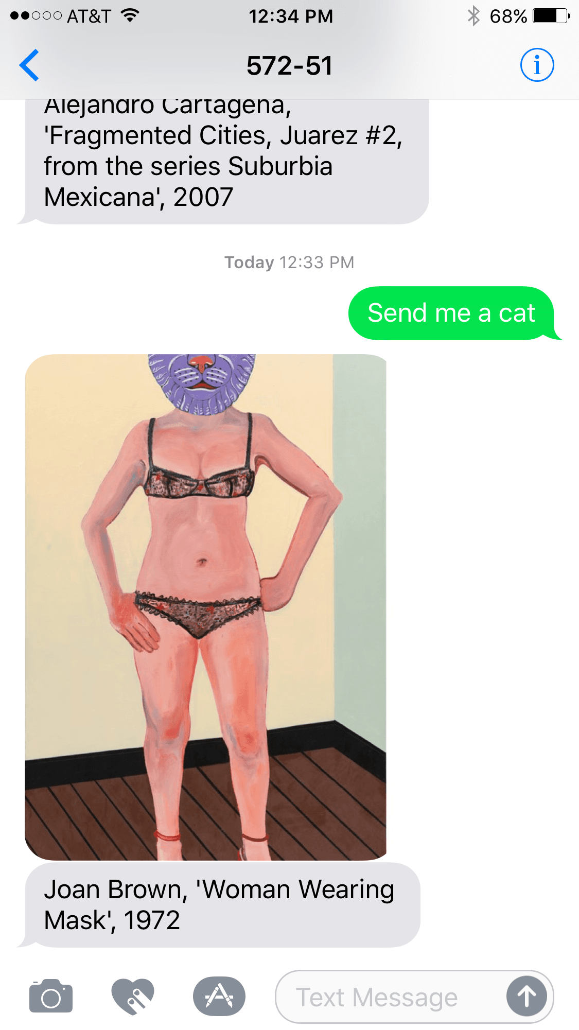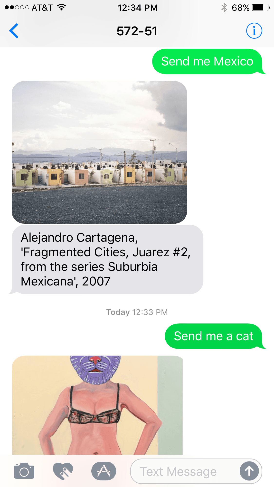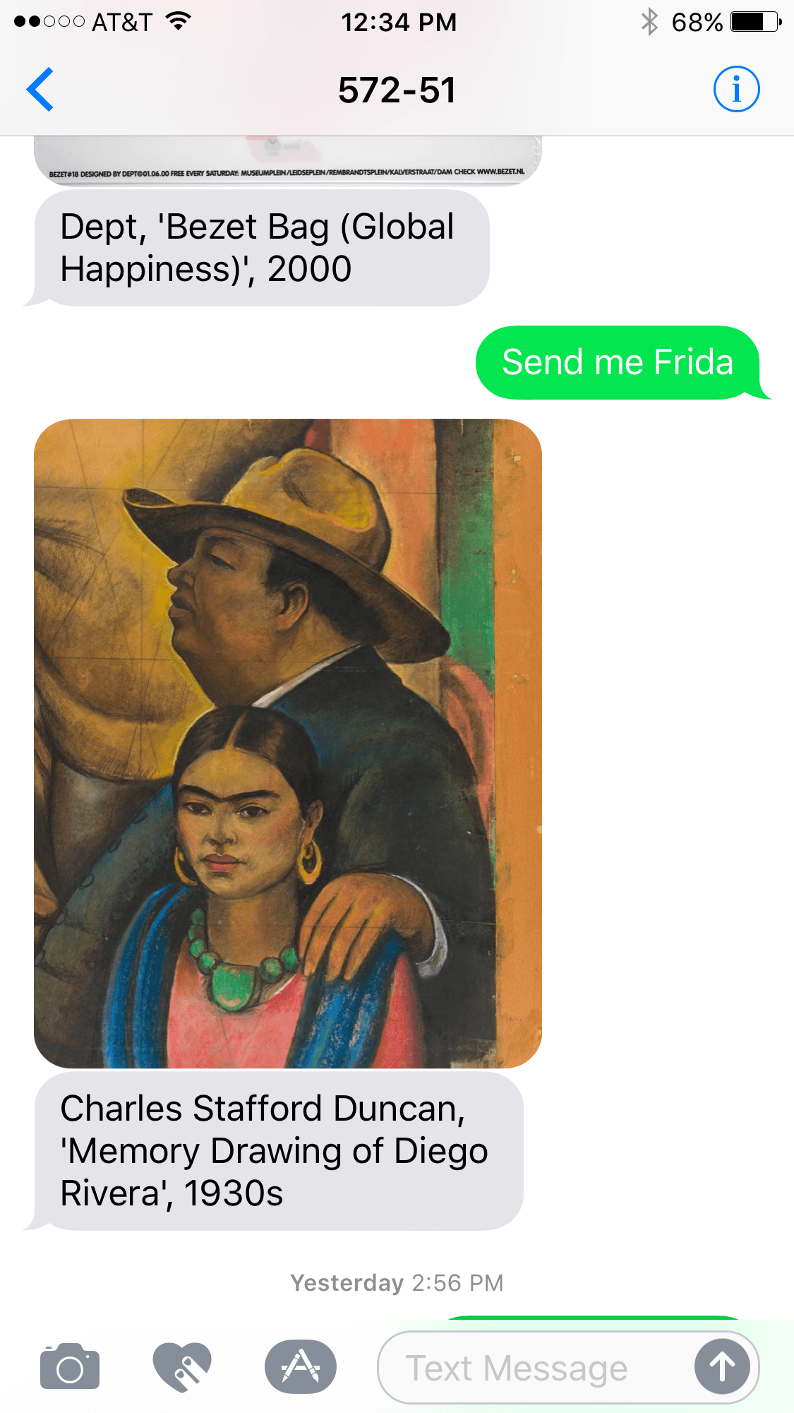 Como pasa en muchos museos alrededor del mundo, el SFMOMA no puede mostrar toda su colección a la vez por falta de espacio. Con este servicio, nos podemos pasar todo el día pidiendo y descubriendo obras de arte. Es bien fácil, solamente necesitas textear la frase en inglés « send me _____ » y en cuestión de segundos te responderán. Puedes de igual manera enviar un emoji y ¡te entenderán perfectamente! ?.