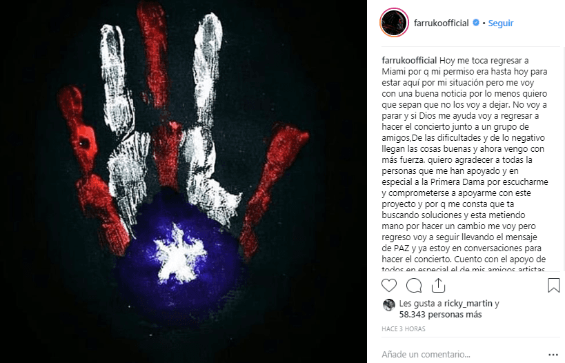 Farruko también tuvo palabras de agradecimiento para los compañeros artistas que se unieron con él en este movimiento por la paz de la isla. De hecho, este viernes en la madrugada, trascendió que Bad Bunny y Residente habrían acudido a La Fortaleza, la casa de gobierno de Puerto Rico, para reunirse con el mandatario Ricardo Rosselló.