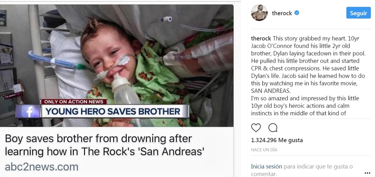 Jacob O'Connor, con apenas diez años, salvó la vida de su hermano de dos años, Dylan, luego de encontrarlo flotando boca abajo en una alberca. Jacob se aventó a la alberca, lo sacó y, recordando una escena de la película San Andreas, protagonizada por Johnson, comenzó a darle el procedimiento conocido como RCP a su hermanito. Le salvó la vida.