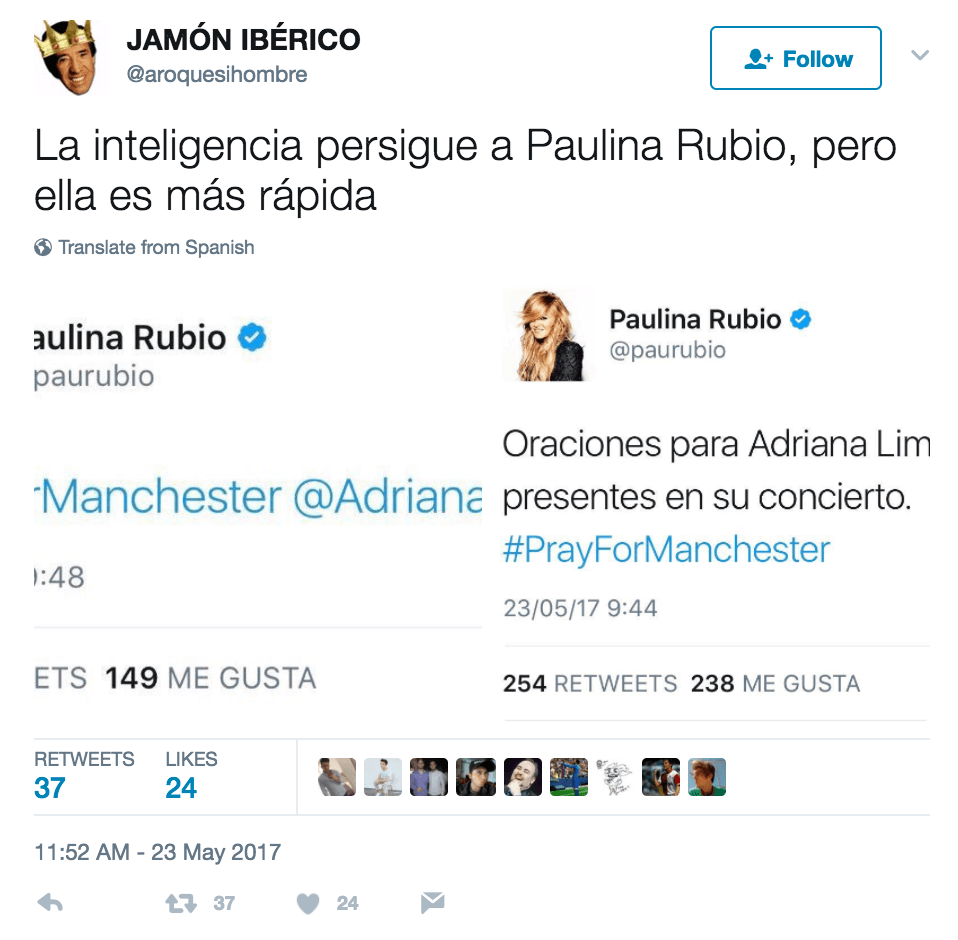 Aquí su respuesta en el momento, un minuto después de la publicación de Paulina Rubio, a las 9:45 am.
