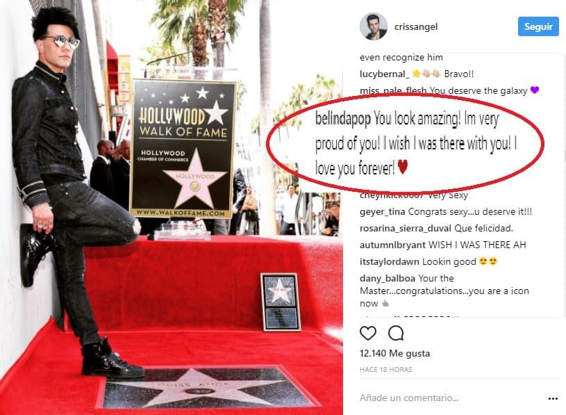 Belinda silenció los rumores de una ruptura con el mago Criss Angel de 49 años de edad y lo hizo de una manera muy romántica, a través de un mensaje que publicó en la cuenta de Instagram donde su novio subió una foto de la presentación de su estrella en el Paseo de la Fama de Hollywood: “¡Te ves increíble!, estoy muy orgullosa de ti, ojalá estuviera allí contigo. Te amo por siempre”.