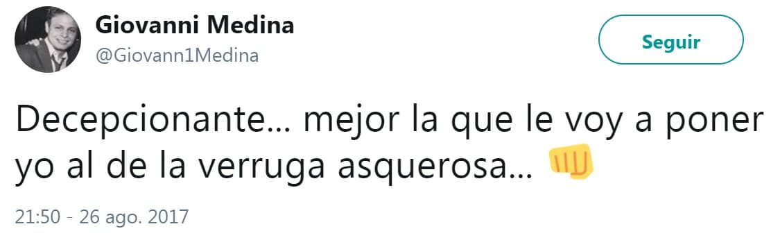 Giovanni Medina escribió en su cuenta Twitter: “Decepcionante… mejor la que le voy a poner al de la verruga asquerosa.” y utilizó el emoticón de un puño.