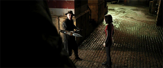En el tráiler vemos brevemente como Dyson (Christoph Waltz), que viste prendas oscuras y porta un martillo cohete, se cruza en un callejón oscuro con Alita mientras estaba en persecución de uno de sus blancos, el cual, por lo que se insinúa, está dispuesto a dar pelea.