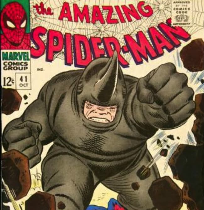 En Marvel existe un sujeto llamado Aleksei Sytsevich que creó Stan Lee para ser un villano de Spider-Man en 1966. Inicialmente un criminal trabajando para los comunistas, este personaje era un don nadie. Voluntariamente participa en un experimento que refuerza su piel y le da más velocidad y mayor fuerza. El polímero, sin embargo, vuelve su piel tan dura como la de un rinoceronte. Los científicos agregaron un cuerno, ya que era una idea bastante viable para el traje. Este traje está adherido a su piel, por lo cual es imposible quitárselo (en su primera representación). Lo cubre completamente a excepción de su rostro.