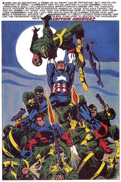 “¿Cómo destruyes un ideal, un sueño?” Nuestro Cap sobre una multitud de soldados Hydra con un poderoso párrafo que nos habla de su perfección. Ya no es un simple payaso en un traje con escudo usado como propaganda de una nación, de ahora en más será el héroe definitivo. Sin dudas que es la imagen de Captain en la Edad de Plata.