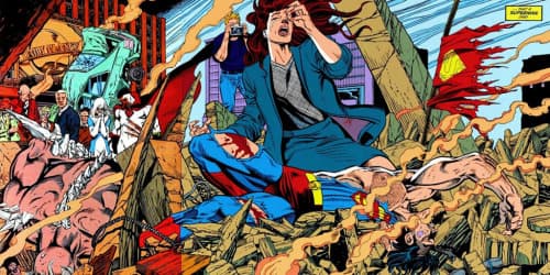 Aquí es cuando el Marketing comenzó a destruir el mundo de los cómics. La viñeta es desvastadora, incluye a Lois Lane tumbada llorando a un Superman aplastado, ensangrentado y destruido. Fue sin dudas un momento que los fans no debieron perderse.