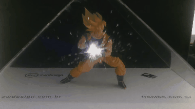 Básicamente, es una figura de Gokú (de las más baratas), pero dentro de un dispositivo holográfico que emula la concentración de ki previa al lanzar un Kame Hame Ha. Aunque el ki de Gokú nos hace pensar que la figura está incinerándose, pagaría todo el dinero del mundo por tener esto en mi mesa de noche.