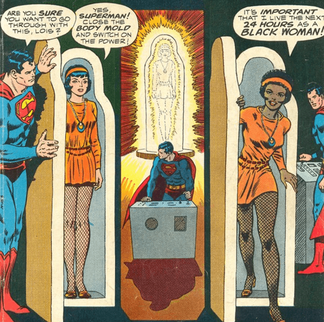 En pleno apogeo de DC y lucha racial de los años 70, se ve como Lois Lane debe hacer una investigación en un barrio pobre de color, así que usa una máquina para convertirse en una mujer afroamericana y poder mezclarse entre los habitantes de esa región. Es de esperarse que el tema causara mucha controversia, implicando desde la minimización de los problemas raciales hasta dar a entender que el simple hecho de ser de color es problemático.