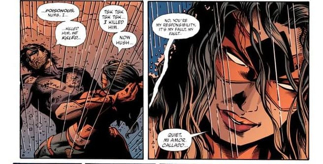 Tras una tensa batalla entre Tarántula y Nightwing contra Bane, Tarántula pierde la cabeza y termina por asesinar a Bane, hecho que descontrola su mente haciéndola que abuse sexualmente de Nightwing, quien además de estar en estado de shock por el asesinato, le repite a la heroína que «no lo toque» más de una vez.