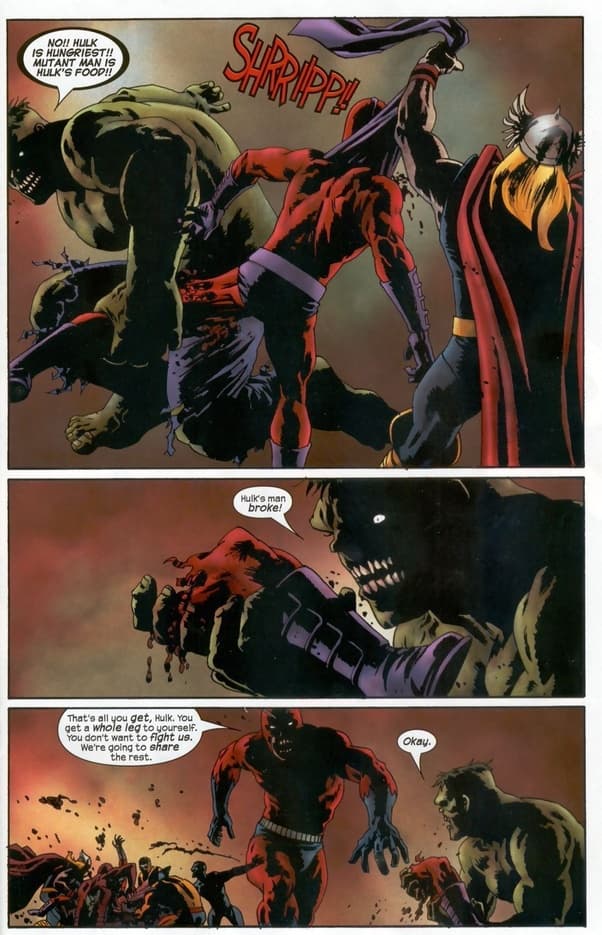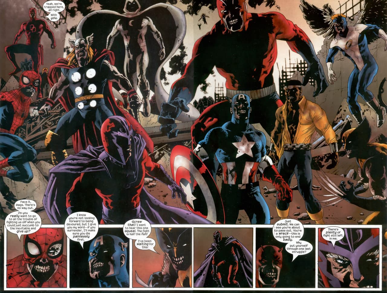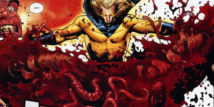 Ultimatum tenía que estar en esta lista, pues tiene una de las muertes más brutales de los cómics. Blob asesina a Janet van Dyne al, literalmente, comérsela y destriparla. Esto despierta la furia de Hank Pym, quien creció hasta volverse Giant Man y en un arranque de ira, muerde la cabeza del villano para luego escupirla.