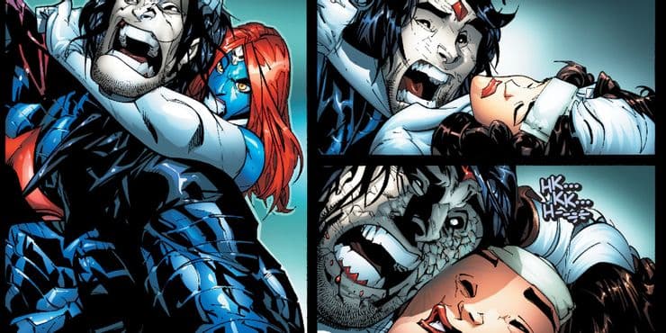 Lo gracioso de la situación es que la mutante azul arroja a Mr. Sinister sobre Rogue, quien se encuentra completamente noqueada. Al quedar mejilla con mejilla el poder de la sureña se activa y comienza a absorber la energía vital del villano hasta la muerte.