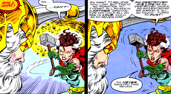 Por ello, me siento un poco feliz de ver a Loki cumpliendo (momentáneamente) con su sueño. En el tan aclamado Avengers & X-Men: Axis #9 (en realidad es malísimo), Loki es capaz de sostener el Mjolnir; es más, casi derrota a su hermano, de una vez y para todas. De no ser por la intervención de Scarlet Witch, Doctor Doom, y Red Skull (inverted), Thor habría sucumbido completamente.