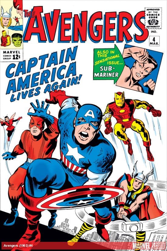En Avengers #4 (Marzo, 1964) de Jack Kirby, el más famoso grupo de superhéroes descongeló al más famoso soldado de la Segunda Guerra Mundial para que se una a sus huestes. La batalla enfrentó a los Avengers contra Hulk y Namor. Genial sin dudas.