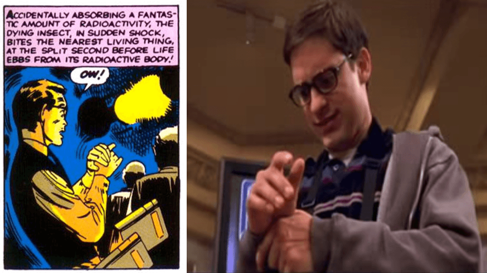 Lo mismo sucede en las películas. Sin embargo en este caso el lugar donde Peter recibe la picadura varía entre la saga original de Raimi y The Amazing Spider-Man de Marc Webb. En el caso de la primera trilogía, el lugar escogido para la picadura de la araña es el dorso de la mano, tal cual sucediera en Amazing Fantasy #15, cortesía de Steve Ditko.