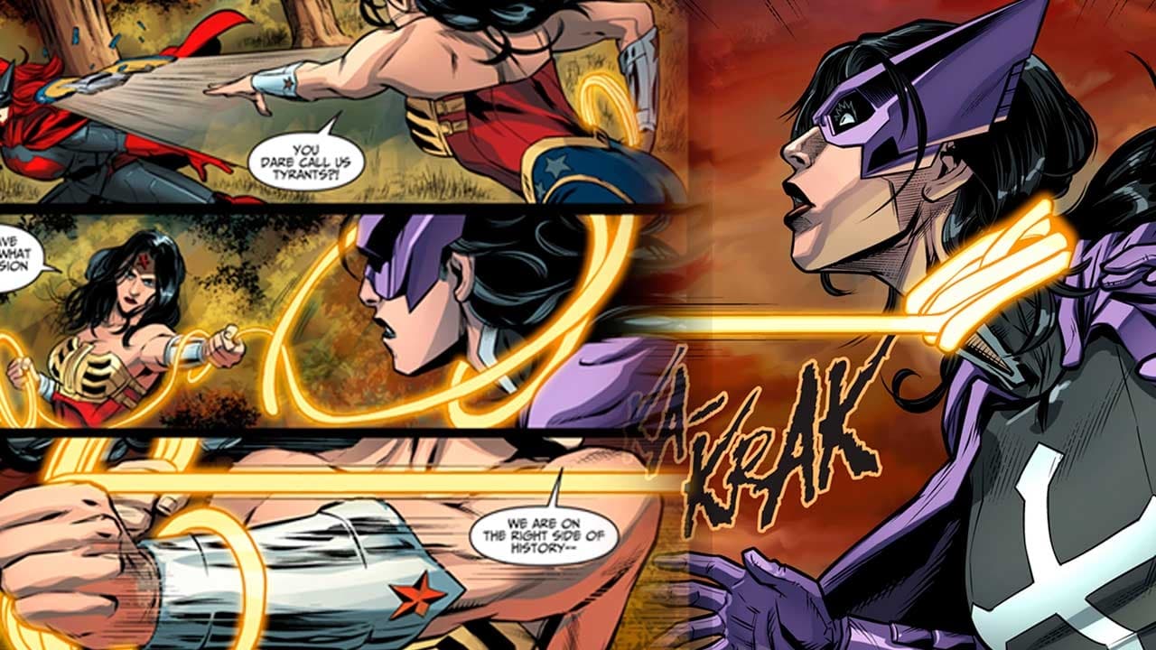 Evidentemente, no todos los héroes estaban de acuerdo con el autoritarismo de Superman, por lo que organizan rebeliones para detenerlo. En una de las batallas contra los rebeldes, Wonder Woman defiende a su amigo y se enfrenta a Huntress, a quien le rompe el cuello con su lazo.