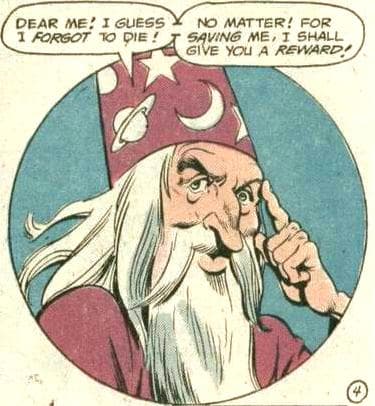 Superboy en una competencia de fuerza con un anciano que termina humillando totalmente al joven que luego se convierte en el héroe más fuerte de la Tierra. A favor de Superboy hay que decir que la identidad del anciano en realidad es la de Merlín, el mago más poderoso del planeta.