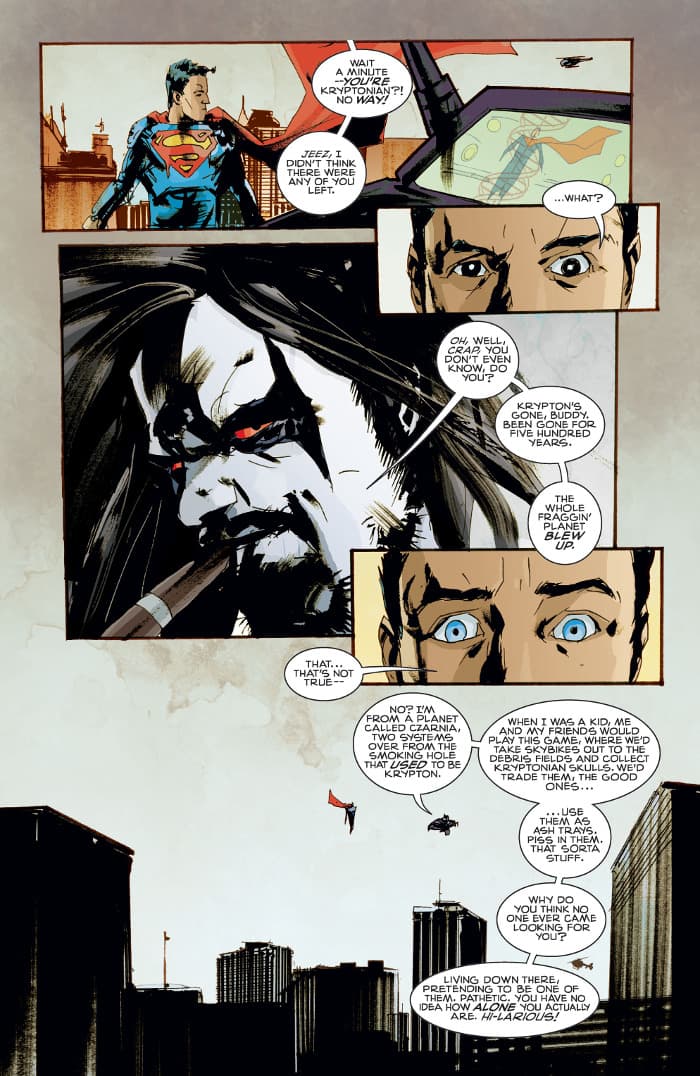 Ya habiendo adoptado su identidad de Superman y su característico traje azul y rojo, Clark conoce a un mercenario del planeta Czarnia que viene por un "trabajito" en la Tierra. Su nombre es Lobo, y es un verdadero hijo de %#&$. El diálogo entre los dos es genial, mientras Lobo le cuenta un poco de Krypton y lo denosta de forma gratuita, Clark se mantiene asombrado al enterarse que su planeta explotó.
