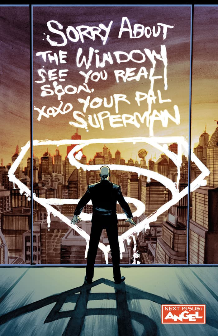Tras un ataque increíblemente destructivo por parte de Parasite, Clark se enterará de que el creador de tal monstruo no es otro que el mismísimo Lex Luthor. Al ir a encararlo, Lex emplea toda su inteligencia para denigrar a Clark, demostrándole que no hay forma en que pueda demostrar su culpabilidad en los hechos. Si bien eso golpea a Clark muy duro, tras tomar un segundo aire le deja este amigable mensaje en la ventana a Lex: "Perdón por la ventana. Te veré muy pronto. Besos y abrazos, tu amigo Superman".