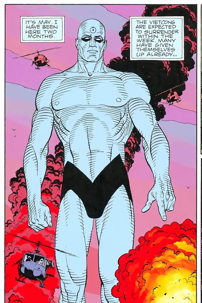 Durante su viaje por el multiverso, el Doctor Manhattan aprendió una cosa: sin importar las realidades, sigue siendo uno de los seres más poderosos de todos.