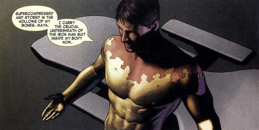 Gracias a la modificación del Virus Extremis, Tony Stark logra esconder el traje que usa bajo su armadura en los espacios que quedan dentro de sus huesos. Eso le permitirá llamar a la armadura de forma automática. Eventualmente logrará introducir la armadura completa en el mismo espacio, por lo que puede activar y desactivar su traje de manera automática en caso de emergencia. Sin duda, el mejor lugar para esconder armamento es dentro de uno mismo, por lo que hace del portador un efectivo soldado a la hora de luchar contra el crimen