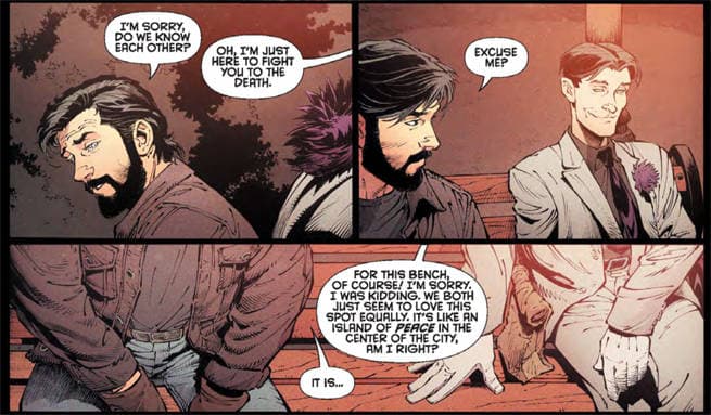 Y estoy aquí para que peleemos a muerte para siempre. Así inicia una particular conversación que Bruce Wayne tiene Joker durante el arco argumental Superheavy, uno de los últimos a cargo de Snyder y Capullo en el New 52. Bruce está sufre de amnesia pero cuando empieza a recordar su pasado como Batman, Joker se hace presente para rogarle que no vuelva a convertirse en el murciélago. El villano también posee una vida normal desde la desaparición del héroe y obviamente desea conservarla al tiempo que salva a Bruce, un hombre que siempre sufrió la carga de ser Batman. Las cosas no salen como el retirado príncipe payaso del crimen quería, pero la escena es sin dudas increíble.