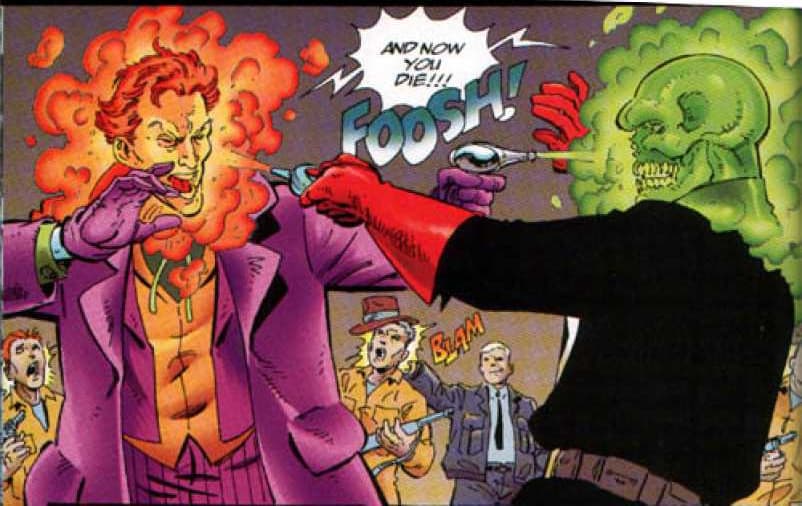 Las épocas en que Marvel y DC Comics hacían crossover... qué tiempos para vivir. El enfrentamiento entre Joker y Red Skull ocurrió en las páginas de Batman and Captain America de John Byrne e involucró una traición. Originalmente los villanos empezaron trabajando juntos pero en un punto le debe haber dejado de parecer divertido al payaso ya que se dio vuelta y comenzó a patear traseros nazis. Incluso ayudó a Batman y Captain America a detener el avión de Red Skull que llevaba una bomba atómica destinada a detonar en Washington D.C.
