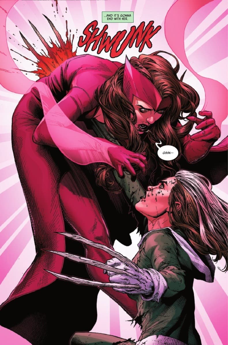 Un intento de Steve Rogers por reunir de nuevo a los mutantes y a los Avengers terminó en desgracia. Rogue, quien tenía un fuerte resentimiento contra Wanda, aprovechó que había absorbido los poderes de Logan para atravesar a la Bruja Escarlata con sus nuevas garras.