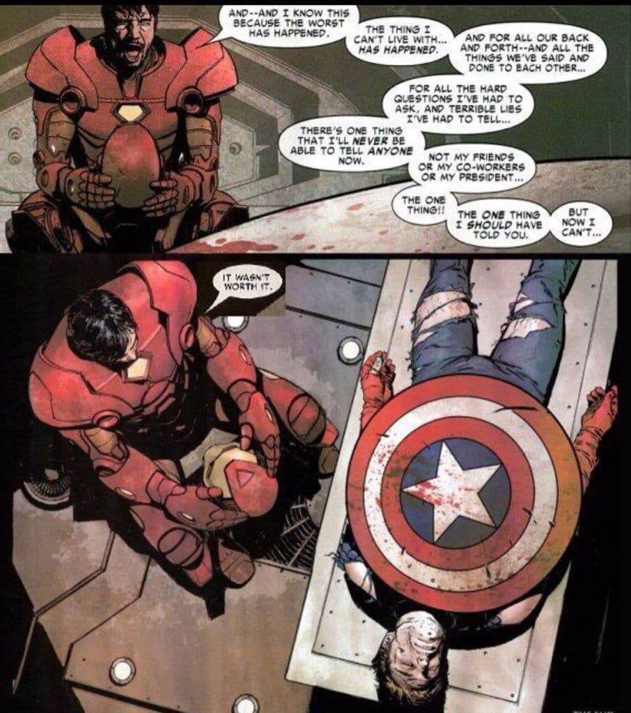 Carol, frustrada y desesperada, se enfrenta a Iron Man y lo golpea de manera brutal, terminando con su vida.
