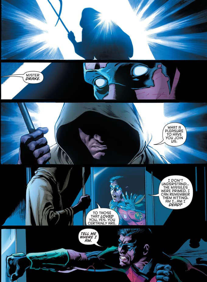 La explosión que debería haber terminado con la vida de Tim transporta su cuerpo hacia otro lugar, una especie de prisión impenetrable custodiada y dirigida por alguien que, muy posiblemente (según las pistas dadas al momento), sea Ozymandias.