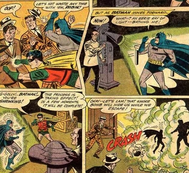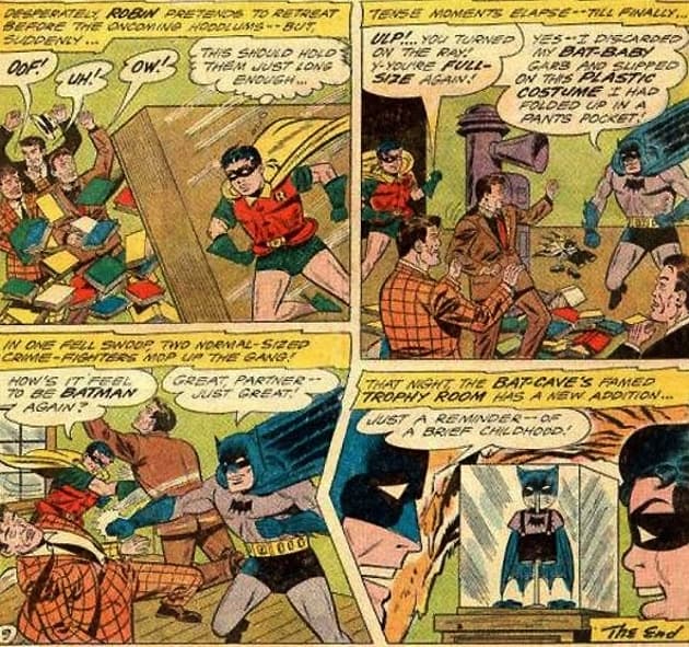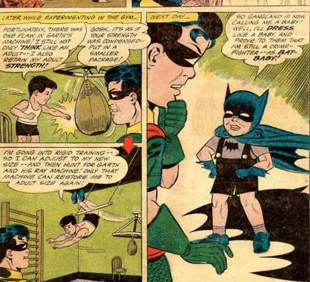 En 1961 sale a la venta la issue de Batman #147 con el apropiado título de Batman Becomes a Baby ( Batman se vuelve un bebé). La historia gira en torno a un Batman disminuído al tamaño de un niño de 4 años gracias a la acción de un dispositivo científico activado de forma accidental. Ya sabes que en el cómic la ciencia hace cosas maravillosas: