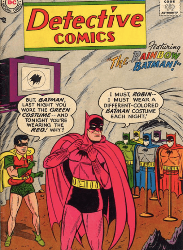 Así que, Batman decide ser lo más extravagante posible para desviar la atención de Robin y que nadie lo descubriera. Cuando ya no es necesario, regresa a su tradicional traje negro.