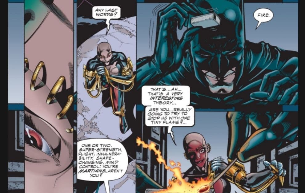 Los marcianos atacaron el avión de Batman, pero al estrellarse y prenderse en llamas el Caballero de la Noche se dio cuenta que su mayor debilidad era el fuego, por lo que pudo enfrentarlos con una caja de cerillos y liberar a los demás superhéroes.