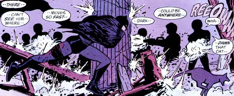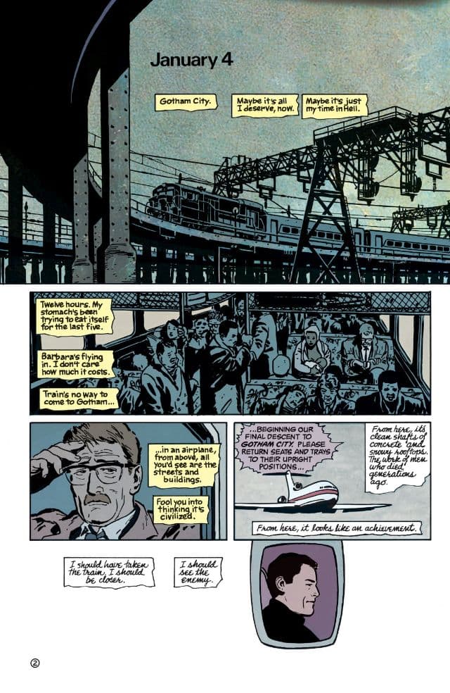 Sin embargo, la imagen no es todo. La pluma de Frank Miller es filosa y realista. Tomando el estilo de narración de los policiales negros, el guionista le otorga el protagónico no a Batman sino a Jim Gordon. El agente es quien empieza a relatar al tiempo que llega por primera vez a Gotham en calidad de teniente. En simultáneo Bruce Wayne regresa a la ciudad después de una ausencia de 12 años. Si bien Gordon está llegando en un tren atestado de gente y Wayne aterriza en un aeropuerto repleto de paparazzis esperando su arribo, hay algo que tienen en común: son hombres en busca de redención.