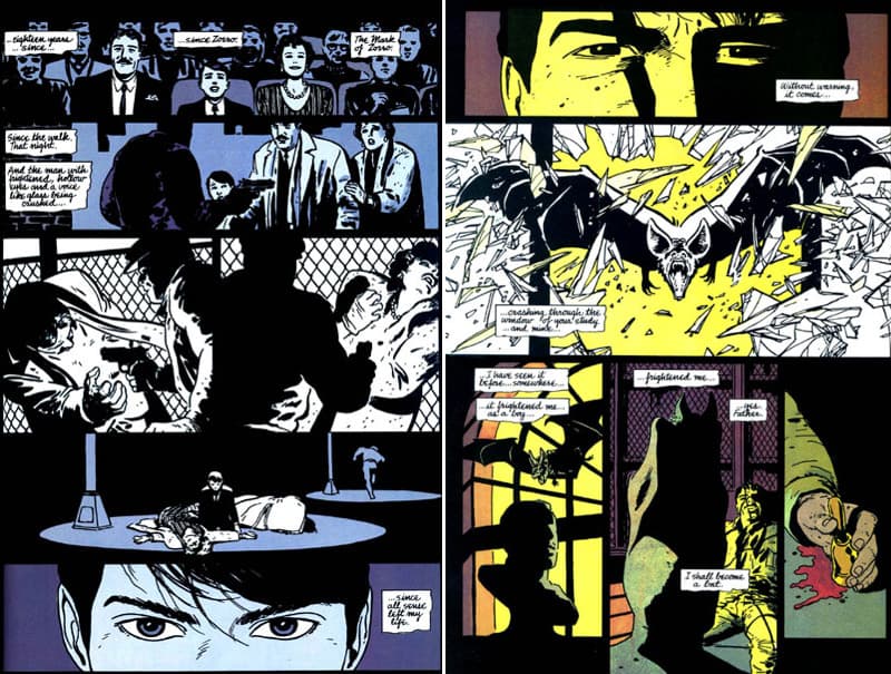 La elección es simple. Se trata de la escena final del primer episodio, donde un Bruce Wayne derrotado después de su primera batalla contra el crimen regresa a su mansión. Mientras permanece sangrando sobre un sillón, observa un busto de su padre. Solo logró sacar una conclusión de su primer paseo por East End, la zona más complicada de Gotham: necesito que me teman. Casi desvanecido y mientras revive la escena de la fatídica noche en que sus padres fueron asesinados, le pregunta al busto de Thomas Wayne: "¿Cómo hago, padre? ¿Cómo hago para que me teman?" La respuesta ingresa atravesando la ventana y haciendo añicos los vidrios. En una página que demuestra el genio de Mazzucchelli como montajista, observamos los ojos de un Bruce niño, luego el mismo plano en la mirada cansada del Wayne actual y finalmente el murciélago, que se hace presente destruyendo el vidrio del ventanal. El animal, sumido casi completamente en sombras, se posa sobre el busto de Thomas Wayne. “ Yes, father. I shall become a bat.” (“ Si, padre. Me convertiré en un murciélago”) es la brillante línea con la que Miller le da cierre al primer episodio.
