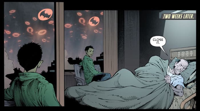 “It's the thing Bruce knew to be true about Batman, more than anything else. The thing we all know, deep down, but don't like to admit... that the story of Batman is, and alwyas will be, a tragedy. Bruce would never have let it be anything else.Batman could live forever. He could escape. But he dosen’t. He dies, just like every one of us. Even though he dosen’t have to”. Cuya traducción es algo así como: “Es la mayor verdad que Bruce sabía sobre Batman, más que cualquier otra cosa. Lo que sabíamos todos en el fondo aunque no quisiéramos admitirlo. La historia de Batman es, y siempre será, una tragedia. Bruce jamás hubiera dejado que fuera algo más. Batman podría vivir para siempre. Podría escapar. Pero no. Muere, igual que todos nosotros. A pesar de que no tendría que hacerlo”.