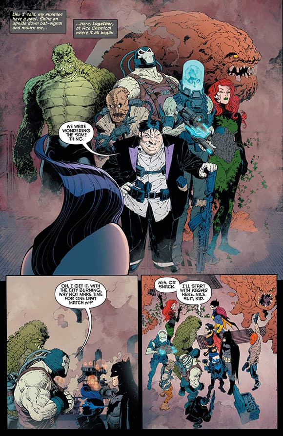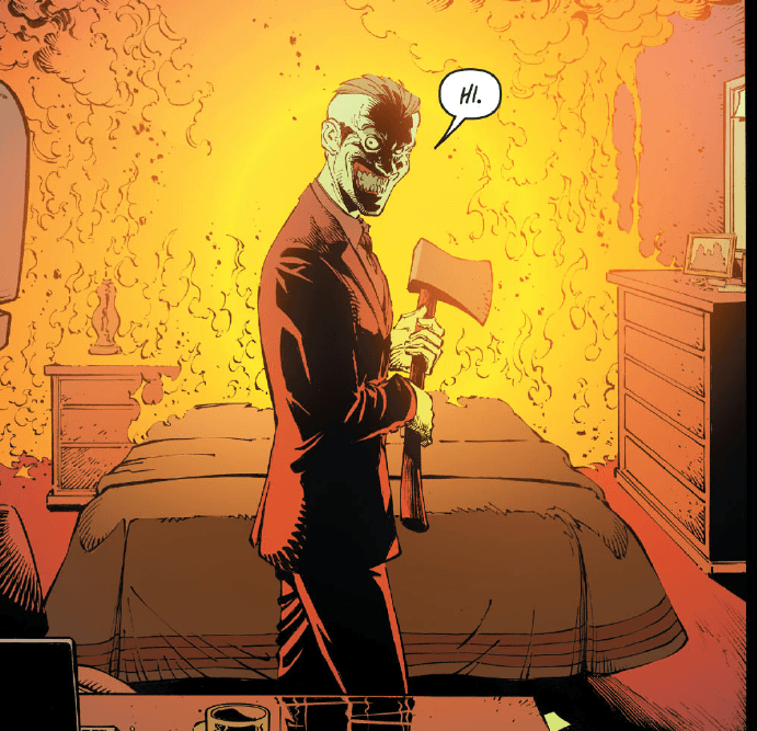 Se trata de una escena que ocurre en el punto medio del arco argumental. Scott Snyder es reconocido por la utilización de elementos de narración muy cinematográficos y Capullo los traduce a la perfección en un excelente trabajo de ilustración. En este caso se trata de un montaje paralelo. Mientras Batman llega a un hospital para tratar de deducir datos a partir del primero de todos los infectados por el virus de Joker, se encuentra hablando vía móvil con Jim Gordon. Cuando la conversación se corta, inicia un montaje paralelo que va de Batman hallando al misterioso paciente 0, a Gordon siguiendo unos ruidos extraños que vienen del interior de su propia casa. Bruce descubre aterrado que el primer infectado con el virus de Joker es Joe Chill, asesino de sus padres (lo cual confirma que Joker conoce su identidad), y se ve presenciando una elaborada dramatización de los eventos de aquella noche fatídica en Crime Alley. Mientras tanto, Gordon es atacado por Joker que se arrastra como una criatura diabólica desde debajo de su cama e incendia el departamento del comisionado.