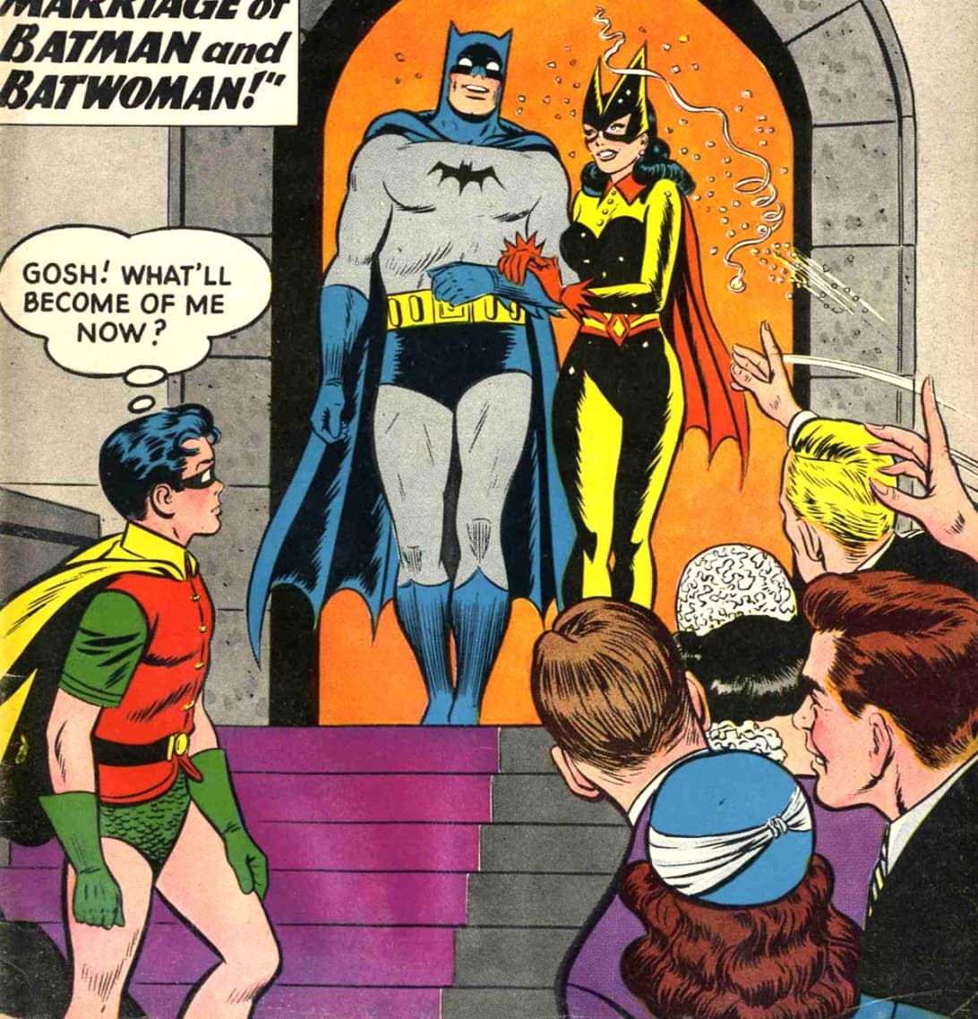 Esto sucedió en Batman #122, aunque en realidad todo fue un sueño de Robin, quien estaba preocupado por todo lo que podría pasar si su padre adoptivo se casaba.