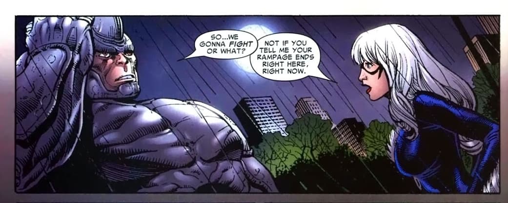 Después de que Rinho le da una brutal golpiza a Peter Parker en Sensational Spider-Man #33, una gata negra muy enojada decide vengarse a su estilo. Black Cat encuentra a Rinho muy borracho, y aprovecha el momento para enfrentarse a él