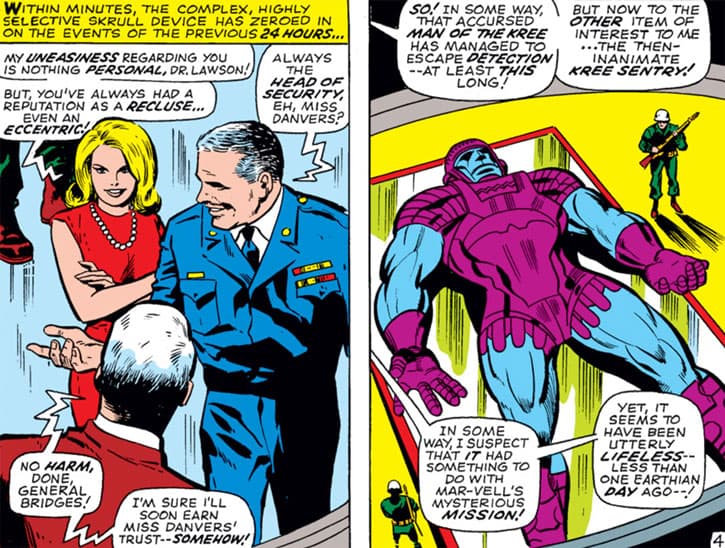 En Marvel Super-Heroes #13 (1968) se introduce por primera vez a Carol Danvers, una piloto de la fuerza aérea que trabaja como jefa de seguridad en la NASA y traba amistad con el doctor Walter Lawson. Pero no sabe que se trata de Mar-Vell, un agente de la raza kree que está en una misión secreta en la tierra como el Captain Marvel.