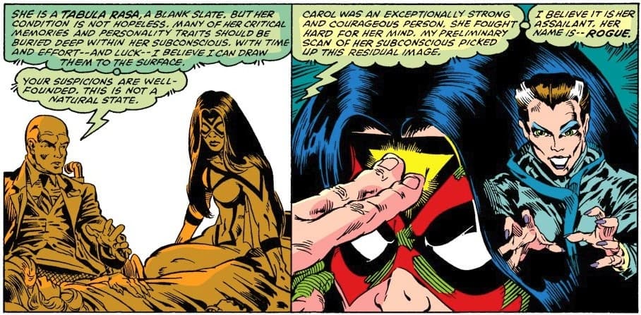 En la época en que Carol Danvers ya se había convertido en una agente y heroína del gobierno, tiene un enfrentamiento con Mystique y su hijastra Rogue, en que la mutante roba sus poderes y deja a Carol en coma. Este evento fue el detonante detrás del cambio de bando de Rogue, quien abandonó a Mystique y a la Hermandad de Mutantes Malvados para unirse a los X-Men. Carol tuvo que reconstruir su vida sin sus poderes, pero ayudó durante años a los mutantes.