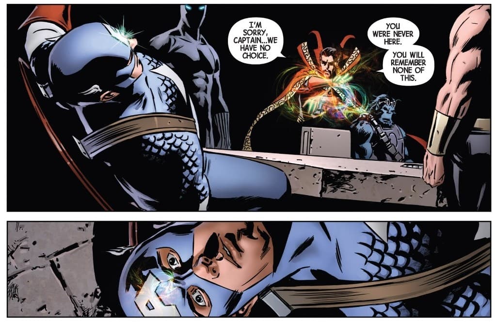 Cuando los Illuminati, grupo del que Captain America no era parte pero con quienes colaboraba frecuentemente, descubrieron que iban a tener que destruir planetas similares a la Tierra para garantizar la supervivencia de la misma, todos aceptaron con tristeza la noticia. Excepto Steve que los convenció de que debía haber otra manera de solucionar la cuestión… o al menos eso pensó. El grupo sabía que lo que estaban haciendo estaba mal pero no podían ver que hubiera otra opción así que borraron de la mente de Captain America aquella conversación y todas sus colaboraciones con los Illuminati para que no tuviera recuerdo de la existencia del equipo. Luego procedieron a hacer lo que tenían que hacer para garantizar la existencia del planeta tierra.