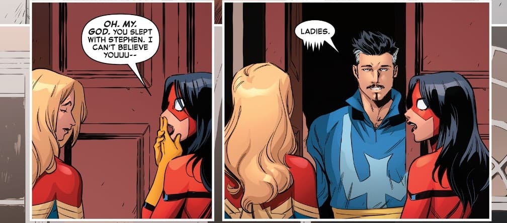 Spider-Woman se da cuenta de la nueva relación entre Strange y Carol, por lo que antes de tratar el tema principal, tiene una platica con ellos.
