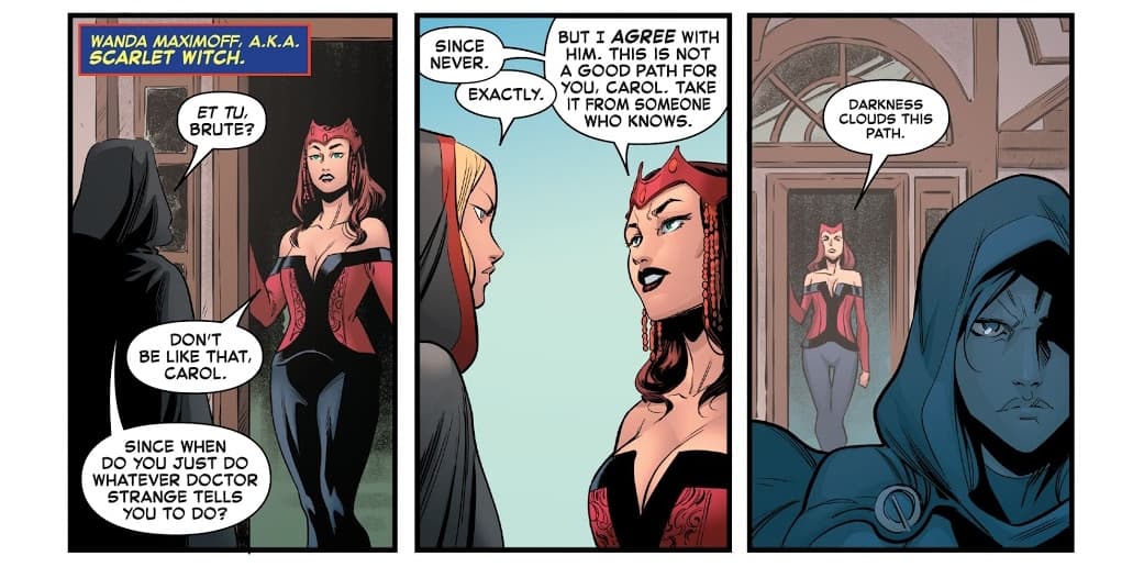 Después de ver a esos usuarios de magia, Carol acude con Scarlet Witch para que sea su maestra, pero sorprendentemente Wanda se niega a ayudarla.