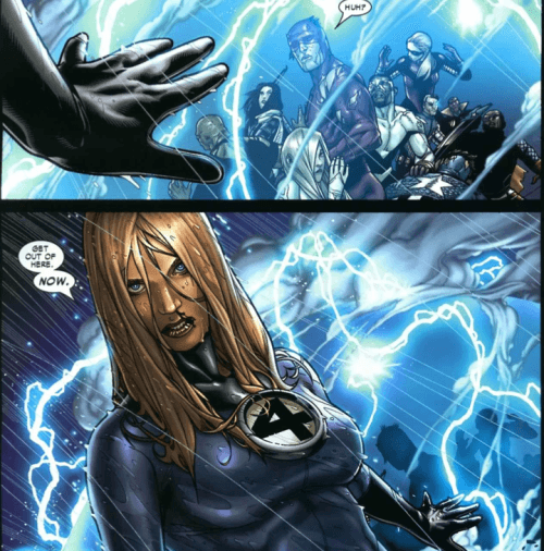 Lo que se ve en la imagen es el momento en el que Sue Storm protege al equipo del Captain America para que puedan escapar de la ira del clon de Thor, luego de que este matara a Goliath. Allí es donde nace la convicción de la mujer invisible sobre lo incorrecto de toda esta confrontación.