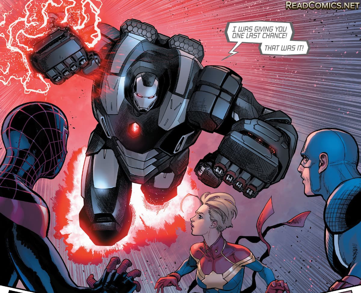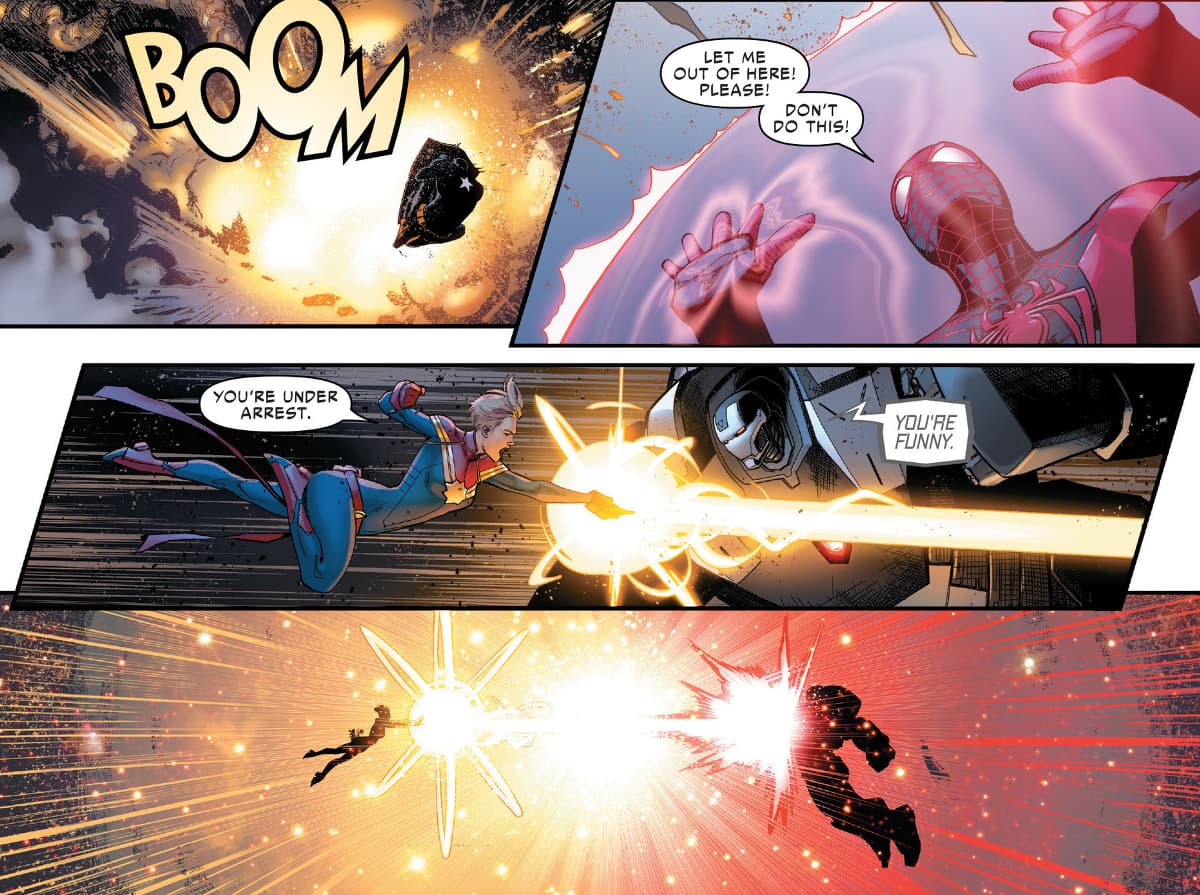 Captain Marvel invita a que Tony dé la cara, y este último responde arremetiendo contra Carol, vestido con un traje poco usual; una armadura muy similar a la que usaba Rhodes, solo que mucho más grande. Los dos héroes colisionan, pero Carol es muy fuerte y, cegada por la ira, de un solo golpe atraviesa la armadura.